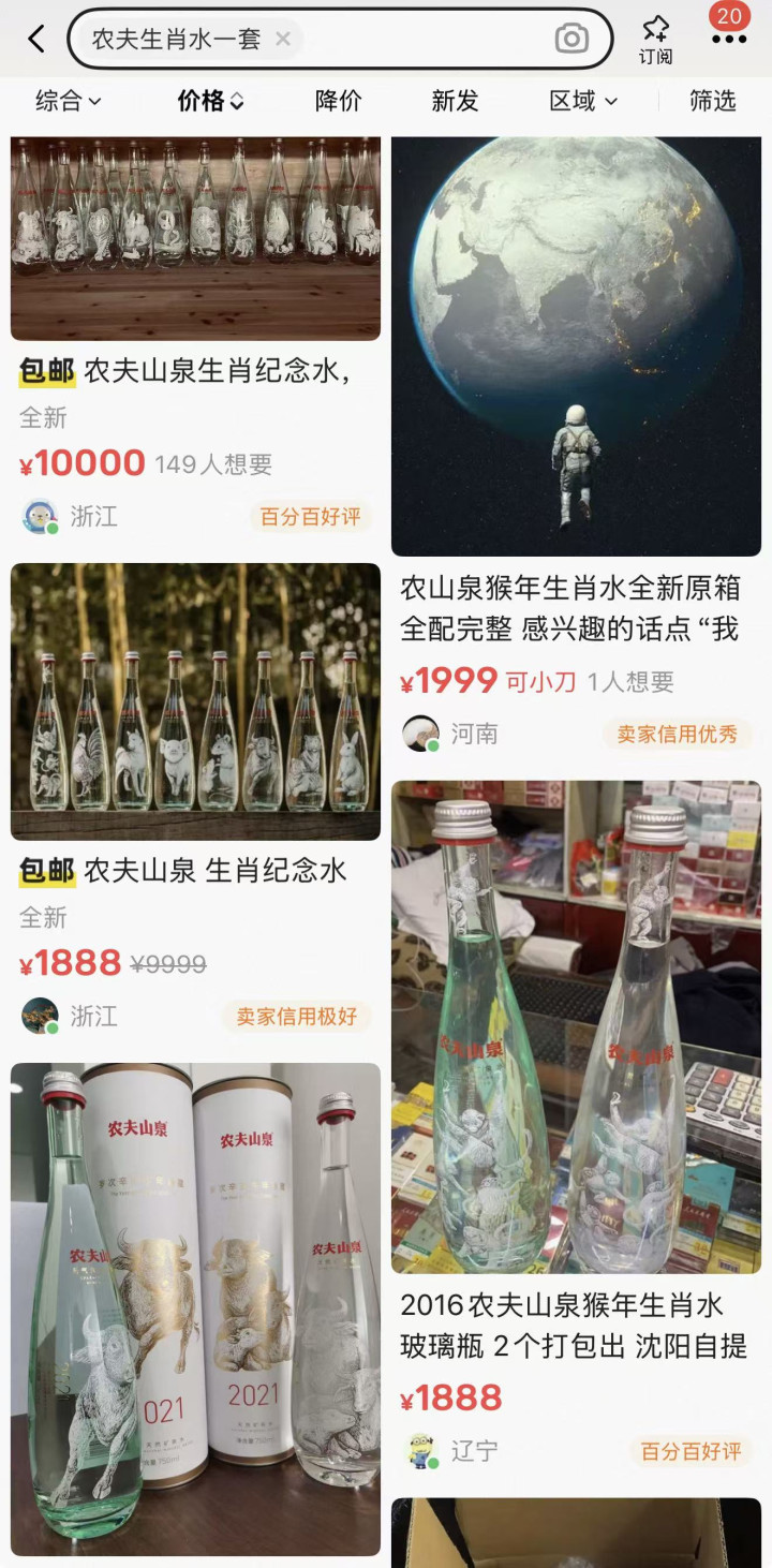 1月22日,界面新闻在二手平台闲鱼发现,有多款农夫山泉生肖水出售信息。一位来闲鱼7年的河南卖家,标价1999元出售农夫山泉猴年生肖水,产品信息显示全新原箱。一位浙江卖家出售农夫山泉生肖纪念水,标价10000元,产品信息写着:“目前共有10套,部分带水和全套包装,部分只有空瓶。”平台信息显示有9.6万人浏览过,149人想要。